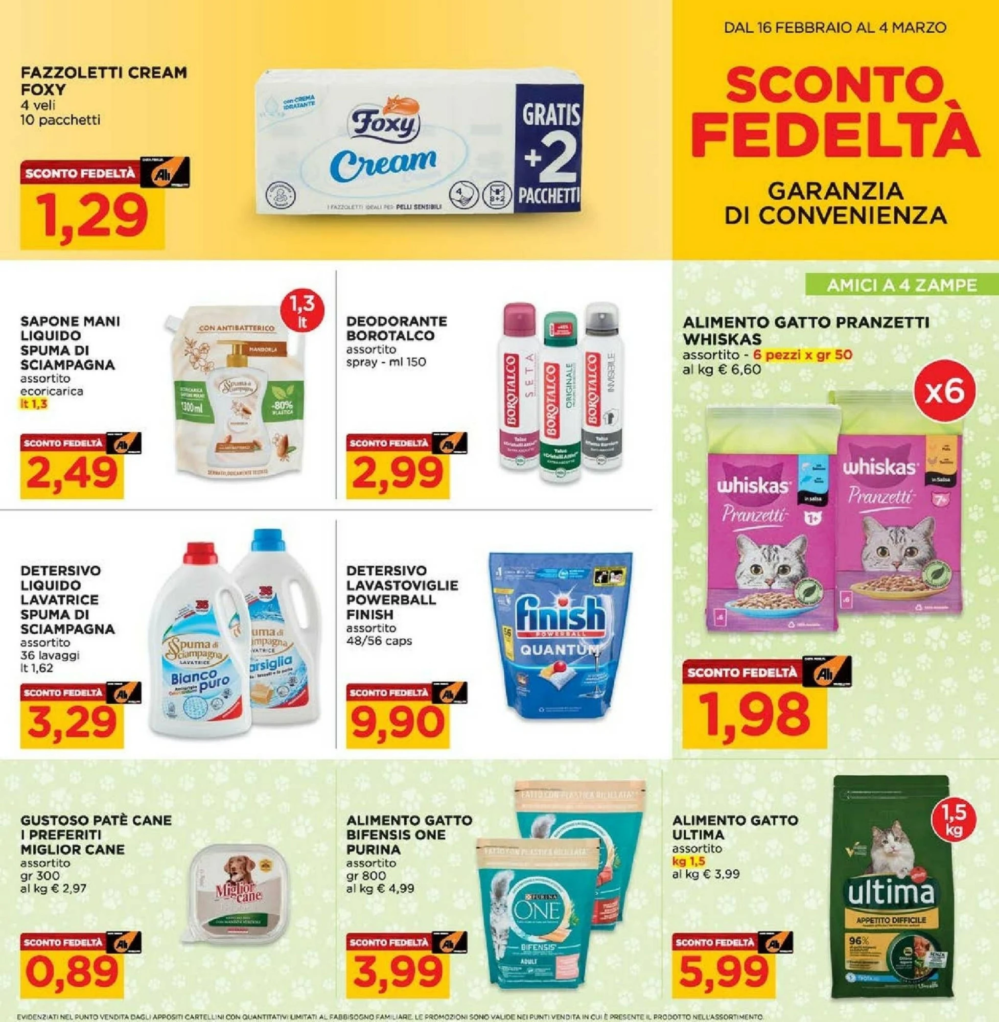 Il volantino Ali dedica ampio spazio anche all'igiene personale e alla pulizia della casa. I fazzoletti Cream Foxy sono a 1.29€, mentre il sapone mani liquido Spuma di Sciampana costa 2.49€. Per la cura del corpo, il deodorante Borotalco è a 2.99€. E per le pulizie di casa, il detersivo liquido lavatrice Spuma di Sciampana è a 3.29€, mentre il detersivo lavastoviglie Finish è a 9.90€. Non manca una crema viso anti-età Dermolab a 9.99€ per la cura della pelle.