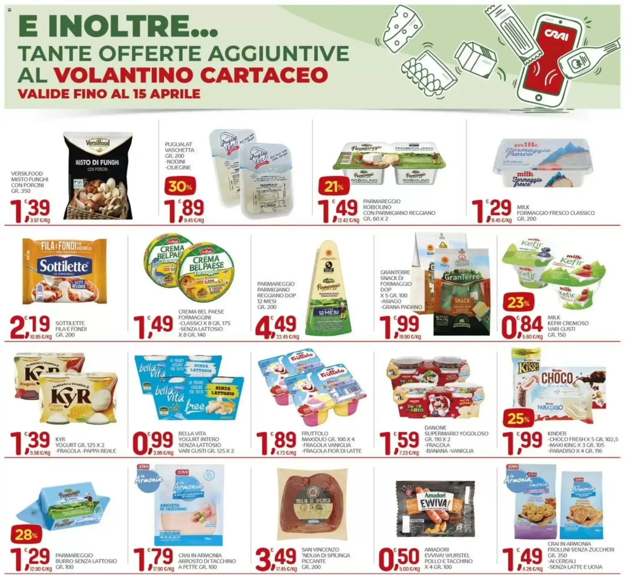 La sezione ortofrutta del volantino Crai porta sulla tua tavola la freschezza e il colore della frutta e verdura di stagione. L'insalata Iceberg e la Primavera a 1.29€ sono perfette per preparare insalate fresche e nutrienti, ideali per i primi caldi primaverili. Le mele Red a 1.59€ e le pere Conference a 1.79€ sono ottime per una merenda sana o per arricchire macedonie e dolci. E per chi ama i sapori più decisi, le zucchine a 1.79€ sono versatili in cucina, perfette sia grigliate che come condimento per primi piatti.