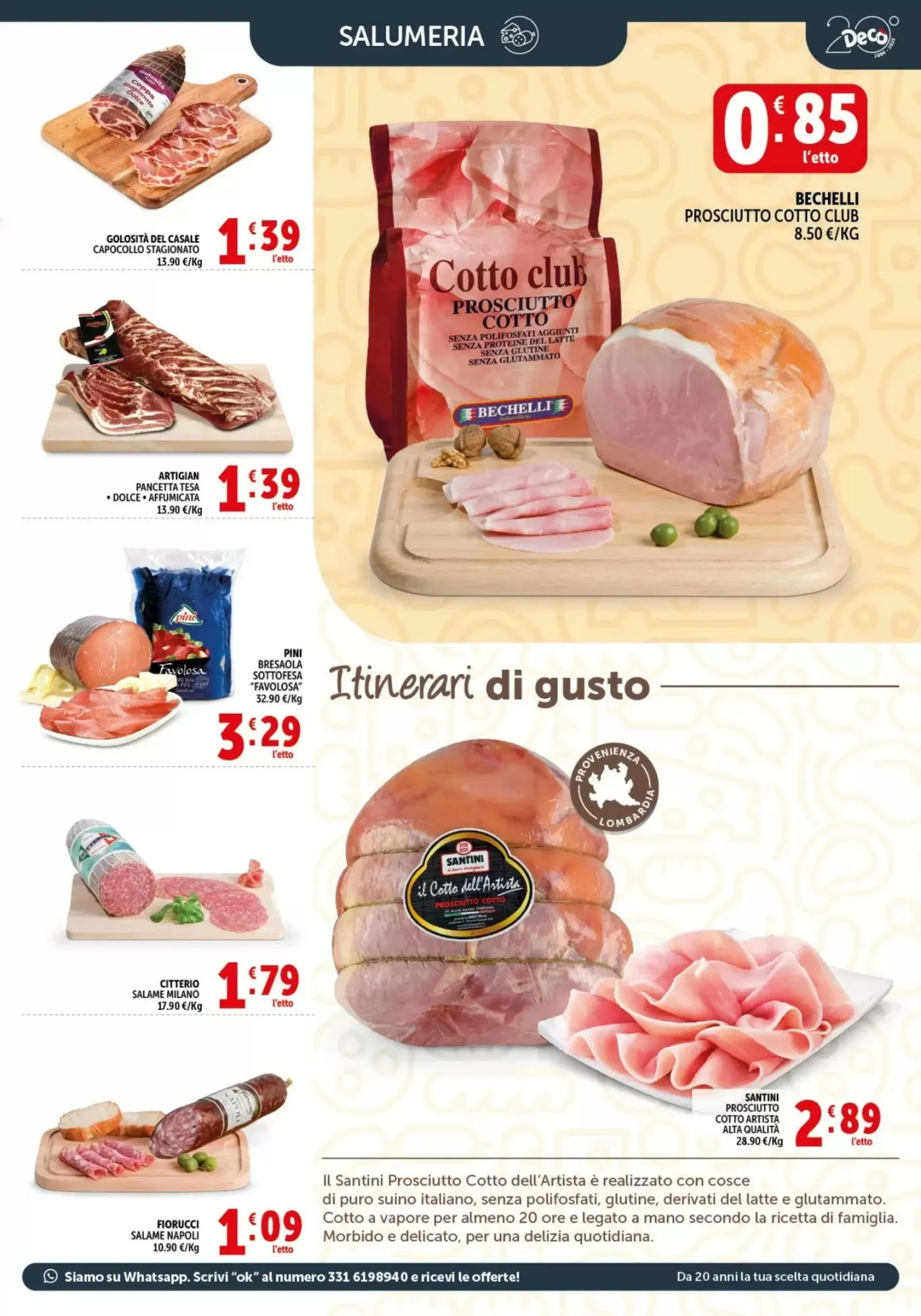 La sezione carne e salumi del volantino offre una selezione di prodotti di alta qualità a prezzi davvero competitivi. Il Bechelli Prosciutto Cotto Club a 0.85€ l'etto è perfetto per la colazione o per preparare tramezzini e piadine. Per gli amanti dei salumi stagionati, il Fiorucci Salame Napoli a 1.09€ è un classico che non delude mai, ideale da servire con pane casereccio e formaggi. Il Citterio Salame Milano a 1.79€ è un'altra eccellenza italiana, perfetto per un aperitivo o per arricchire piatti di pasta fredda. E per chi cerca un'opzione più sostanziosa, il Prosciutto di Parma Montali & Tosini a 2.49€ è un prodotto Dop di alta qualità, da gustare da solo o per preparazioni gourmet.
