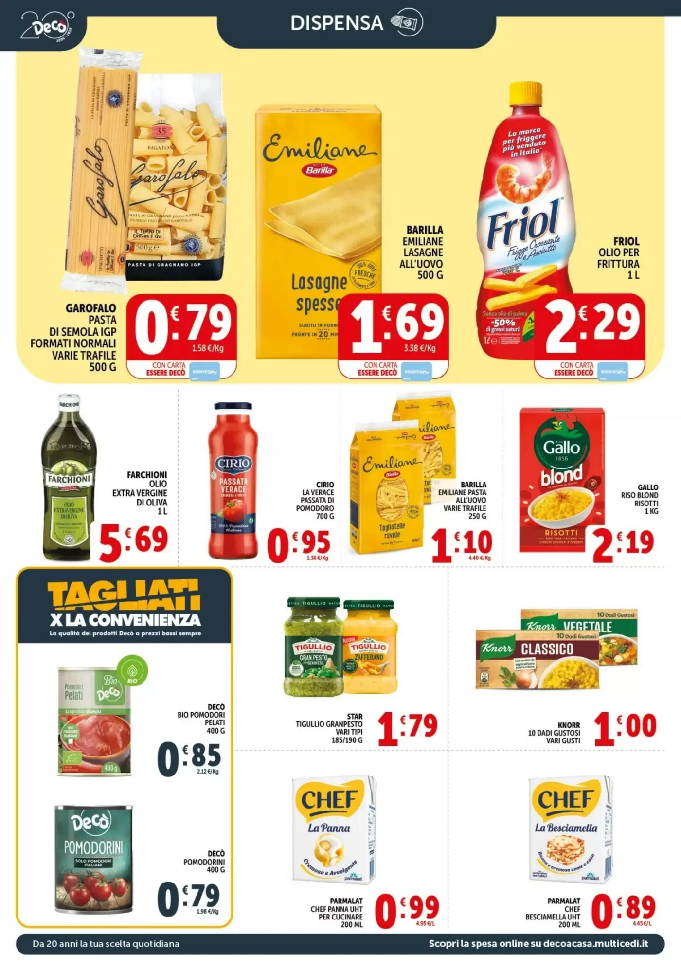 La pasta e il riso sono alla base della cucina italiana, e il volantino Decò Market offre promozioni eccezionali su questi prodotti fondamentali. La Garofalo Pasta di semola IGP 500 G è disponibile a 0.79€, un prezzo straordinario per una pasta di alta qualità che mantiene perfettamente la cottura. La Barilla Farina di Grano Tenero 1 KG a 0.89€ è perfetta per preparare pasta fresca fatta in casa, dolci e impasti lievitati. Per chi ama sperimentare in cucina, il Gallo Chicchi Ricci Riso a 1.69€ è ideale per risotti cremosi e saporiti. E per chi cerca comodità senza rinunciare al gusto, le Lasagne Fresche All'Uovo Sfogliagrezza Giovanni Rana a 1.79€ sono pronte in pochi minuti e garantiscono un risultato sempre perfetto.