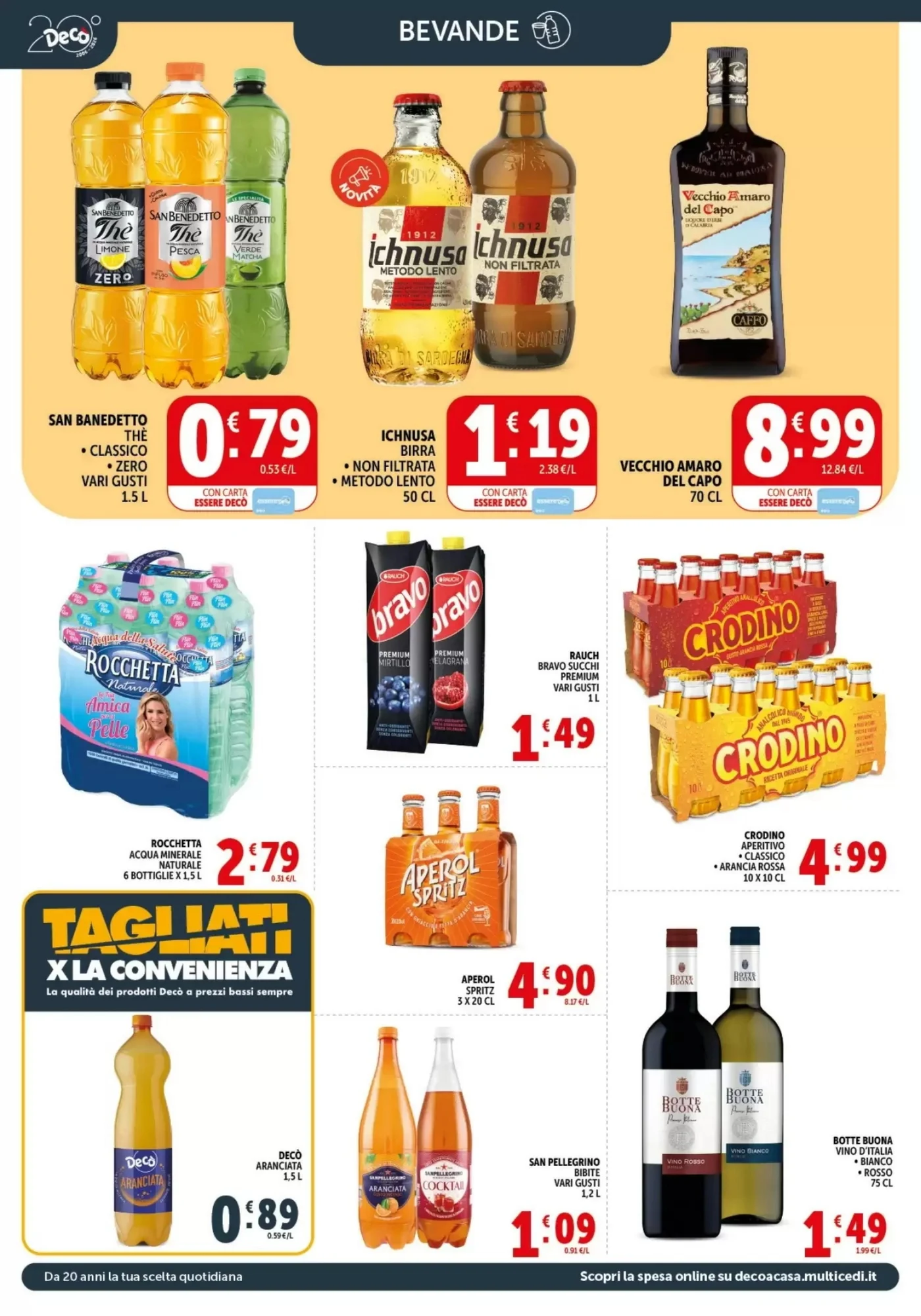 La sezione bevande del volantino Decò Market offre una vasta scelta per ogni momento della giornata. Per chi ama il tè, la Decò Camomilla Setacciata 20 FILTRI a 0.89€ è perfetta per un momento di relax serale. Gli amanti della birra troveranno offerte interessanti come la Moretti Birra Lattina a 0.99€ e l'Ichnusa Birra a 1.19€, ideali per un aperitivo con gli amici. Per chi preferisce il vino, la Botte Buona Vino d'Italia a 1.49€ è un'ottima scelta per accompagnare i pasti. E per chi non rinuncia alle bollicine, la Coca Cola Zero Zuccheri a 2.49€ è disponibile a un prezzo conveniente, perfetta per accompagnare pranzi e cene.