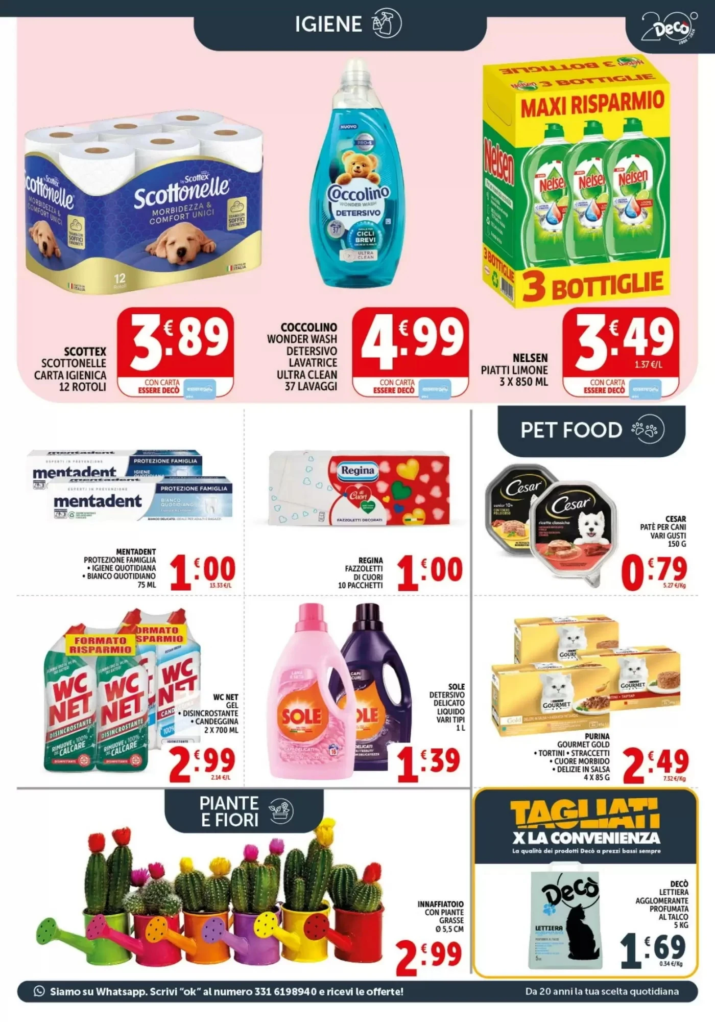 La sezione igiene e pulizia del volantino offre prodotti essenziali per la cura della casa e della persona a prezzi vantaggiosi. Il Sole Detersivo Liquido Vari Tipi a 1.39€ è disponibile in diverse varianti, perfetto per il lavaggio a mano e in lavatrice di capi delicati. Il Nicky Elite Carta Igienica a 1.39€ è un prodotto di qualità che garantisce comfort e resistenza. Per chi cerca un'alternativa più resistente, lo Scottex Scottonelle Carta Igenica a 3.89€ è una scelta eccellente per la pulizia quotidiana. E per il bucato, il Coccolino Wonder Wash Detersivo Lavatrice a 4.99€ assicura pulito e freschezza a ogni lavaggio, con una fragranza duratura che avvolge i capi.