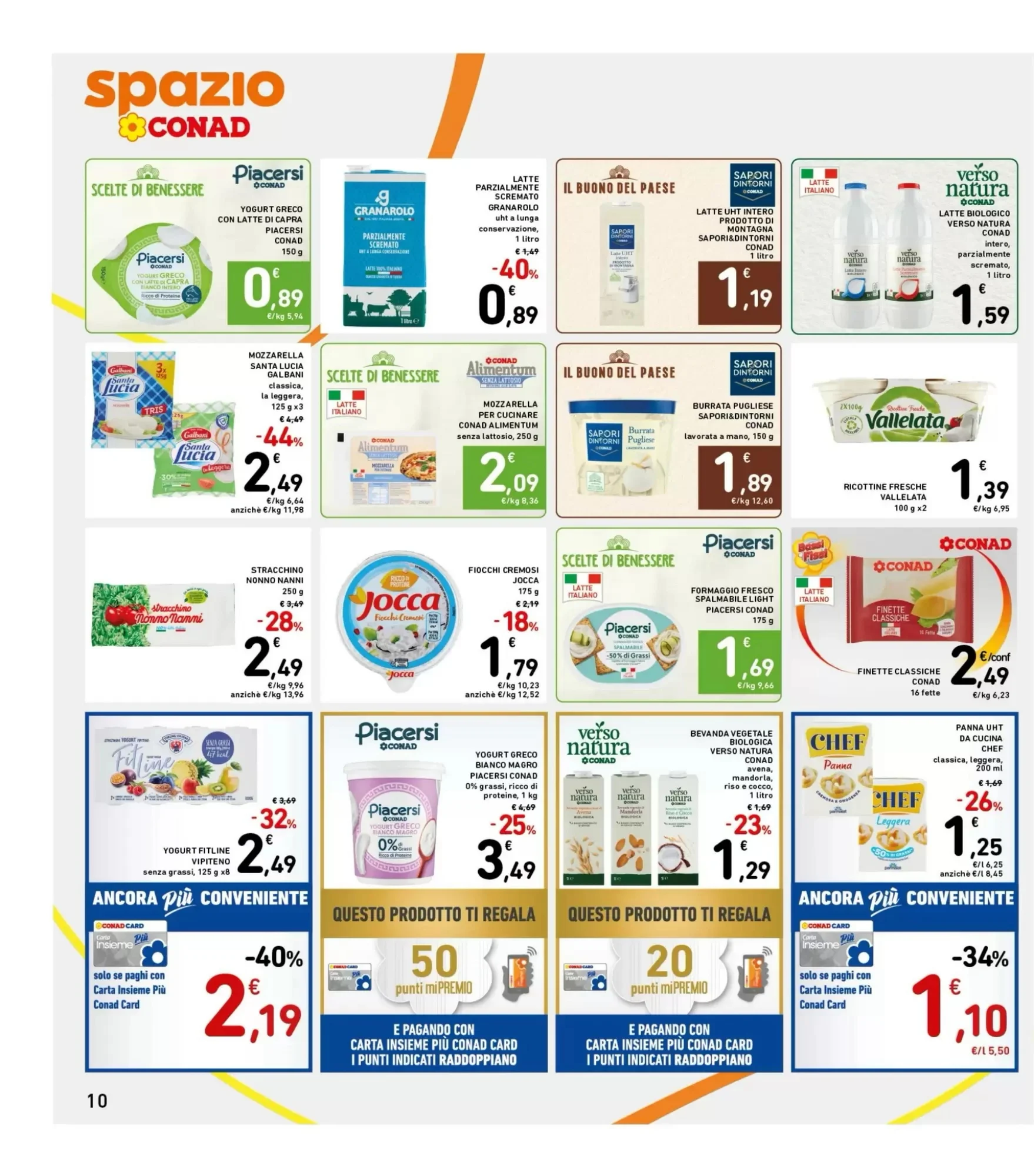 I latticini e formaggi del volantino Spazio Conad offrono freschezza e qualità a prezzi vantaggiosi. Lo yogurt greco con latte di capra costa 0.89€, così come il latte parzialmente scremato. Lo yogurt HiPRO 15g proteine Danone è a 0.99€, mentre il burro Conad Alimentum senza lattosio costa 1.09€. La panna UHT da cucina Chef è disponibile a 1.1€ e 1.25€ a seconda della confezione. Il latte UHT intero costa 1.19€, mentre il latte biologico Verso Natura è a 1.59€.