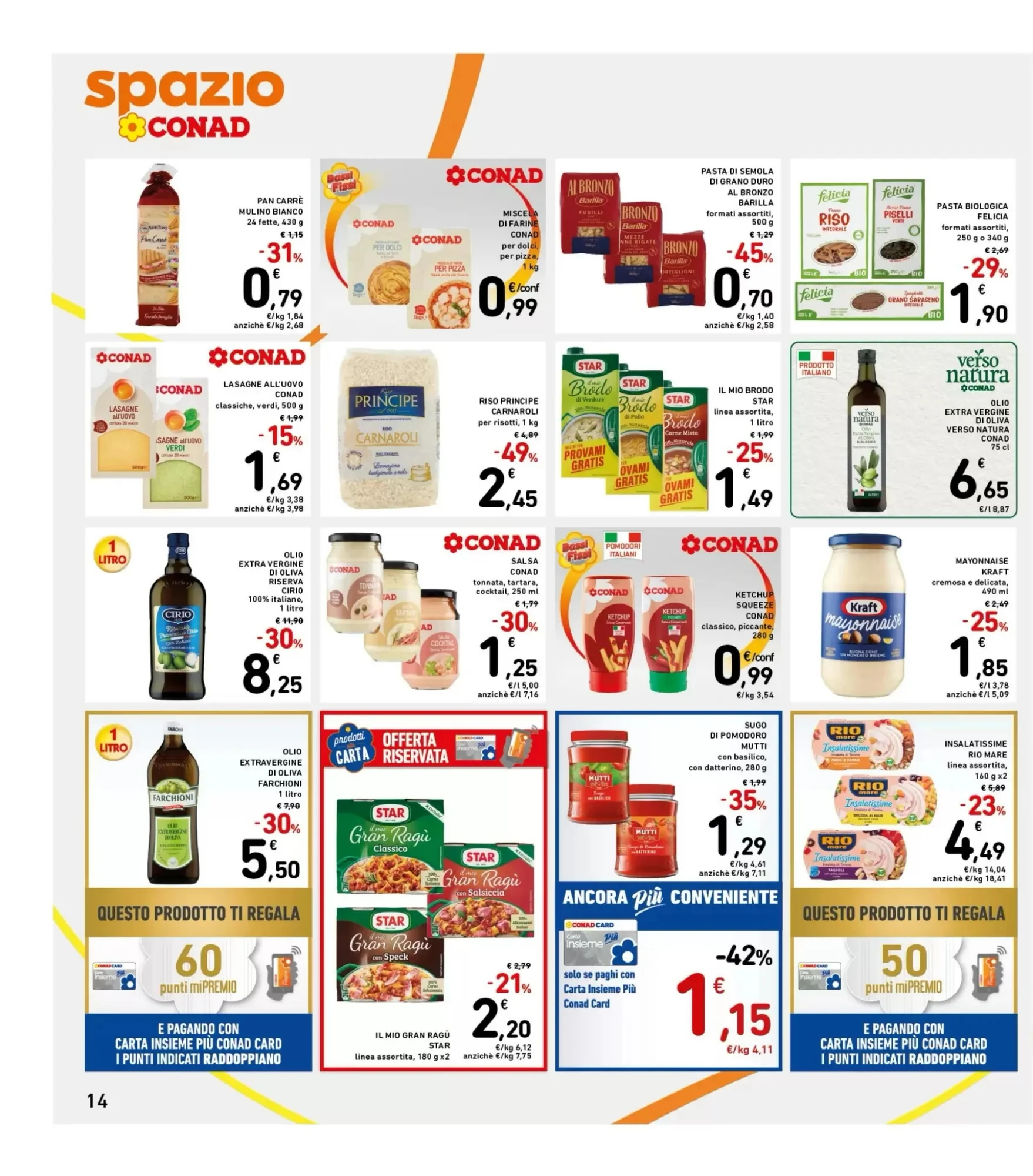 La pasta e il riso del volantino offrono soluzioni per primi piatti perfetti. La pasta di semola di grano duro Al Bronzo costa 0.7€, mentre la passata Garofalo è a 1.0€. Il risotto Knorr ha lo stesso prezzo. Per l'igiene orale, il dentifricio Pasta del Capitano costa 1.29€, così come il collutorio. Le lasagne all'uovo Conad sono a 1.69€, mentre la pasta biologica Felicia costa 1.9€. La pasta fresca ripiena Fini è a 1.99€.