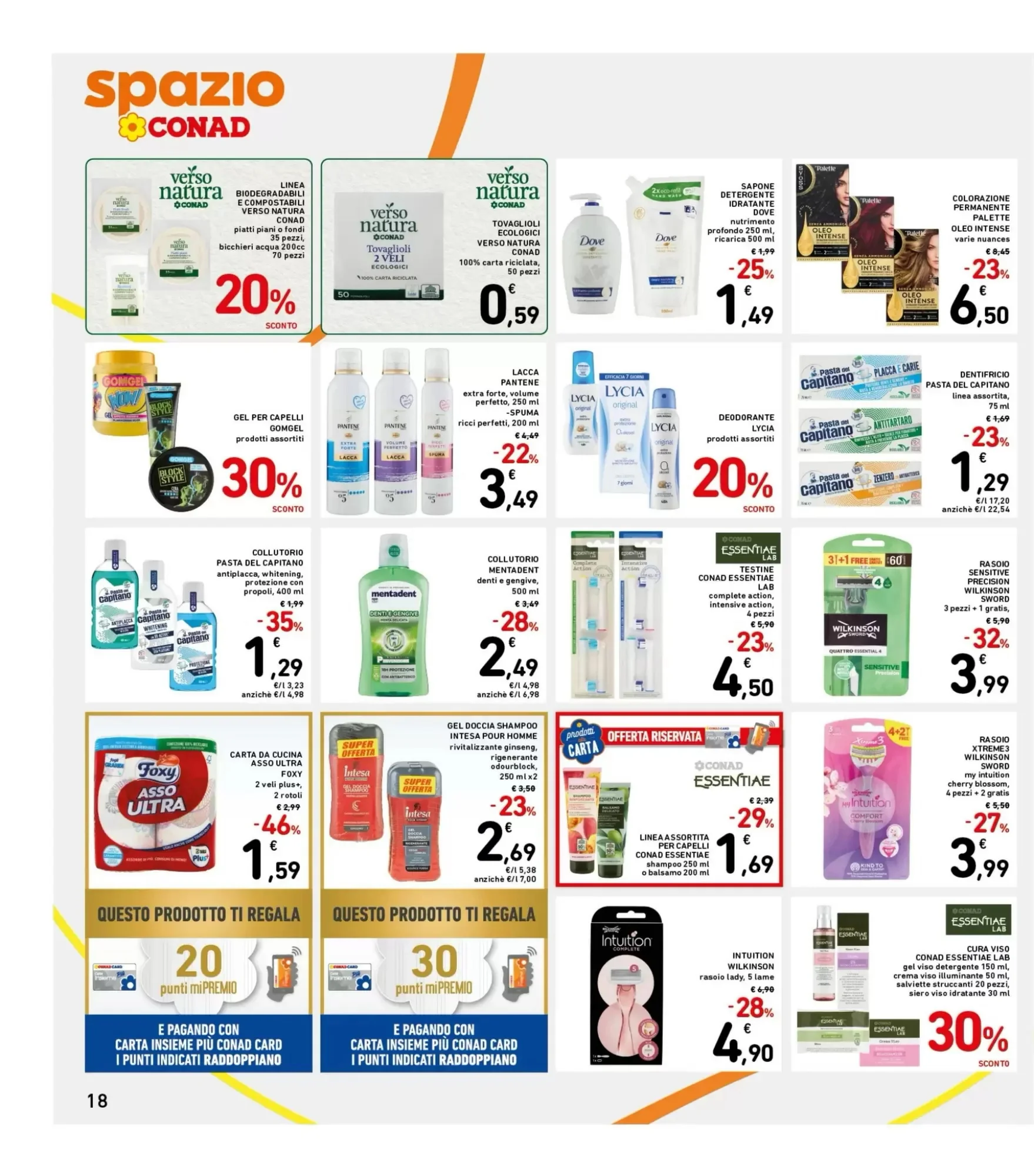 La sezione igiene e pulizia offre soluzioni complete per la cura della casa e della persona. I fiocchi di avena biologici Verso Natura costano 0.9€, mentre il detersivo Verso Natura è a 1.0€. La carta igienica Conad ha lo stesso prezzo, e la bevanda vegetale biologica costa 1.29€. Per il lavaggio dei piatti, il detersivo piatti concentrato Winni's Naturale è a 1.49€, mentre il sapone detergente Dove costa 1.49€. La carta da cucina Asso Ultra Foxy è disponibile a 1.59€.