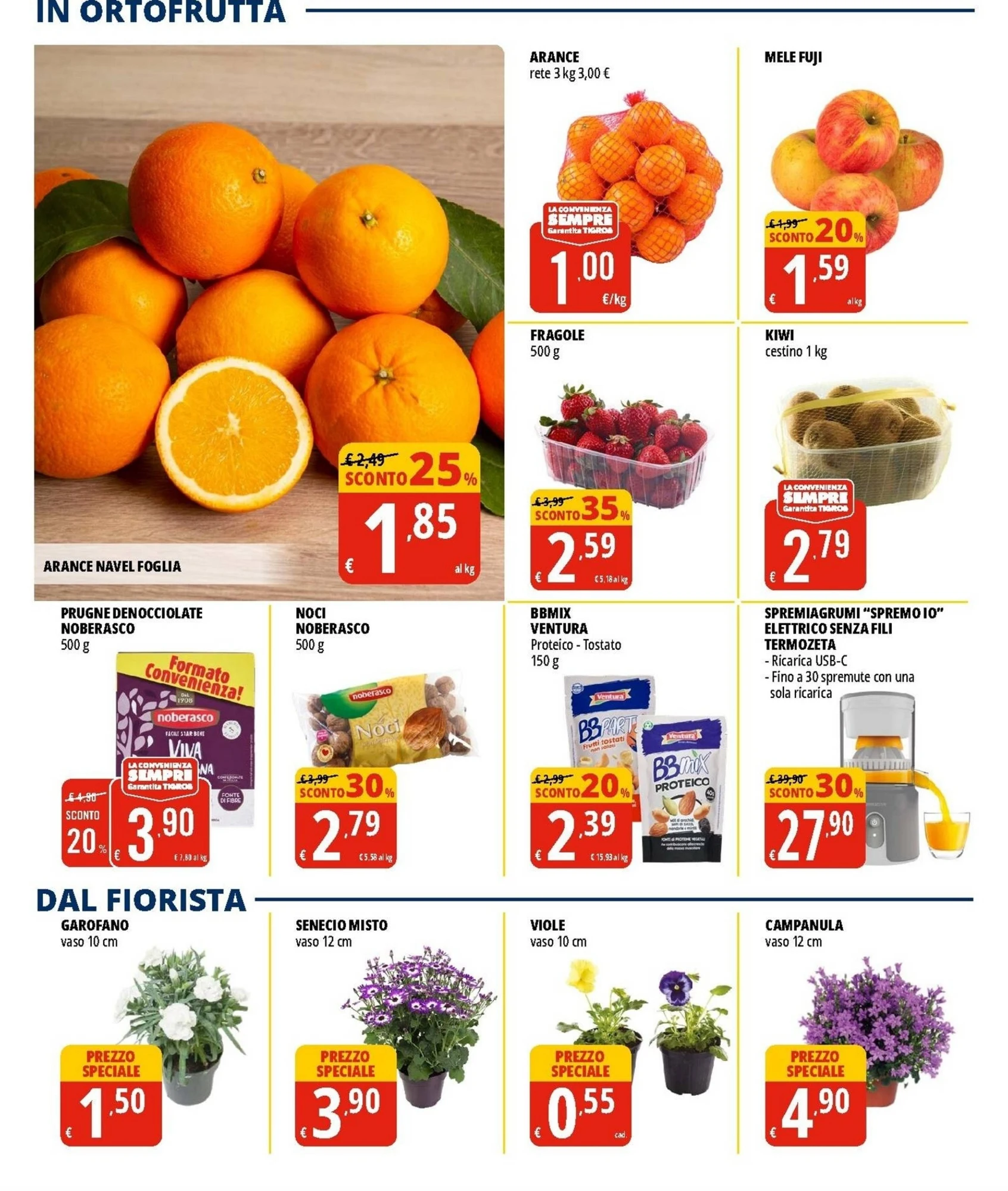 Nella sezione trovi prodotti di uso quotidiano a prezzi stracciati. Le viole da 10 cm costano solo 0,55€, perfette per decorare la casa o il giardino. Il pan baulietto di grano duro Mulino Bianco da 400 g è in offerta a 0,75€, ideale per una colazione veloce. I broccoletti, sia da 500 g a 0,75€ che a 1,00€, sono ottimi per piatti leggeri e nutrienti. Anche il kefir Milk da 150 g a 0,79€ e i würstel classico Wudy Aia da 300 g a 0,99€ completano l'offerta, garantendo varietà senza gravare sul portafoglio.