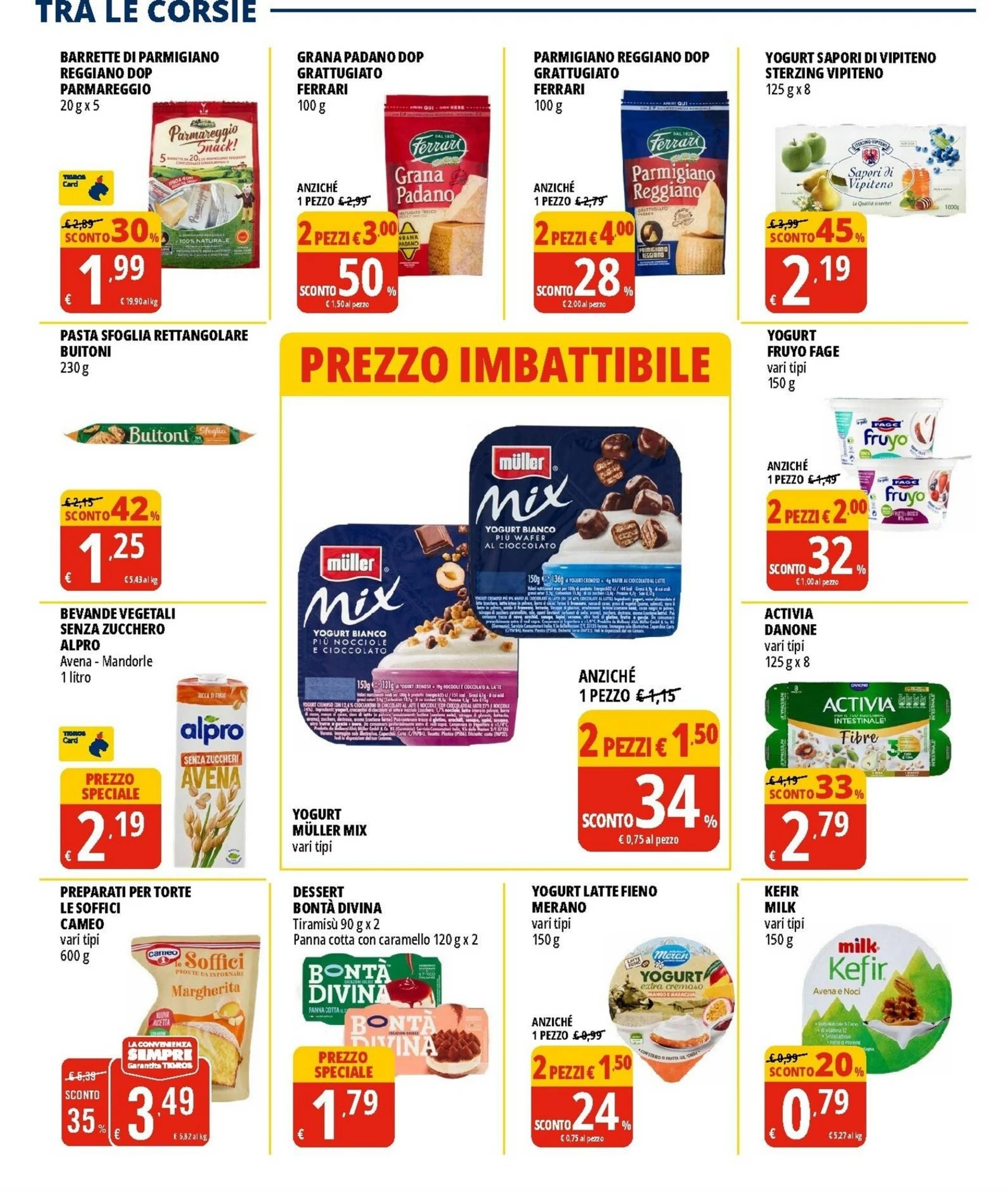 I latticini sono al centro di molte colazioni e ricette. Il latte parzialmente scremato Parmalat da 1 l a 0,75€ è una base versatile per cereali o caffè. Lo yogurt intero Yomo da 125 g (confezione da 2) a 0,75€ è cremoso e nutriente. Per chi cerca varietà, lo yogurt Müller mix a 1,50€ e lo yogurt latte Fieno Merano a 1,50€ offrono gusti diversi. Il Philadelphia Original a 1,69€ è perfetto per spalmare su pane o per salse, mentre la ricotta Santa Lucia Galbani a 1,99€ è ideale per dolci e piatti salati.