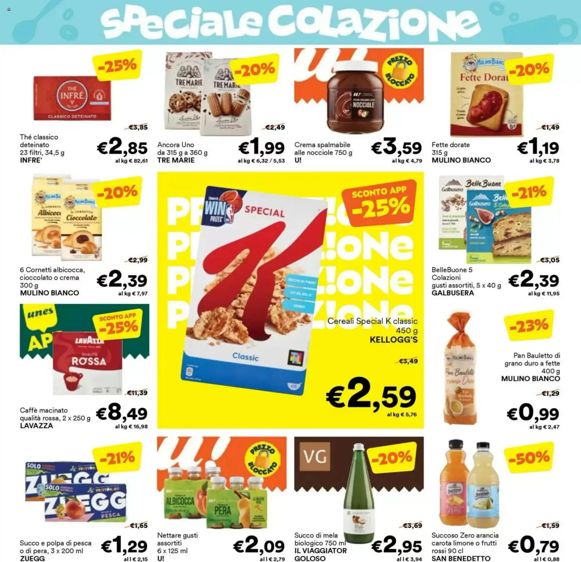 La colazione diventa più golosa con le offerte su snack e dolci. I Kinder Bueno White in confezione da 3 × 39 g costano 1,99 €, perfetti per una pausa dolce. Le barrette al cioccolato con caramello salato, 4 × 46 g, sono in promozione a 2,35 €, ideali per uno spuntino energetico. I cereali Special K classic a 2,59 € offrono una colazione ricca di fibre e gusto, mentre i cornetti assortiti a 2,39 € sono perfetti per una merenda veloce.