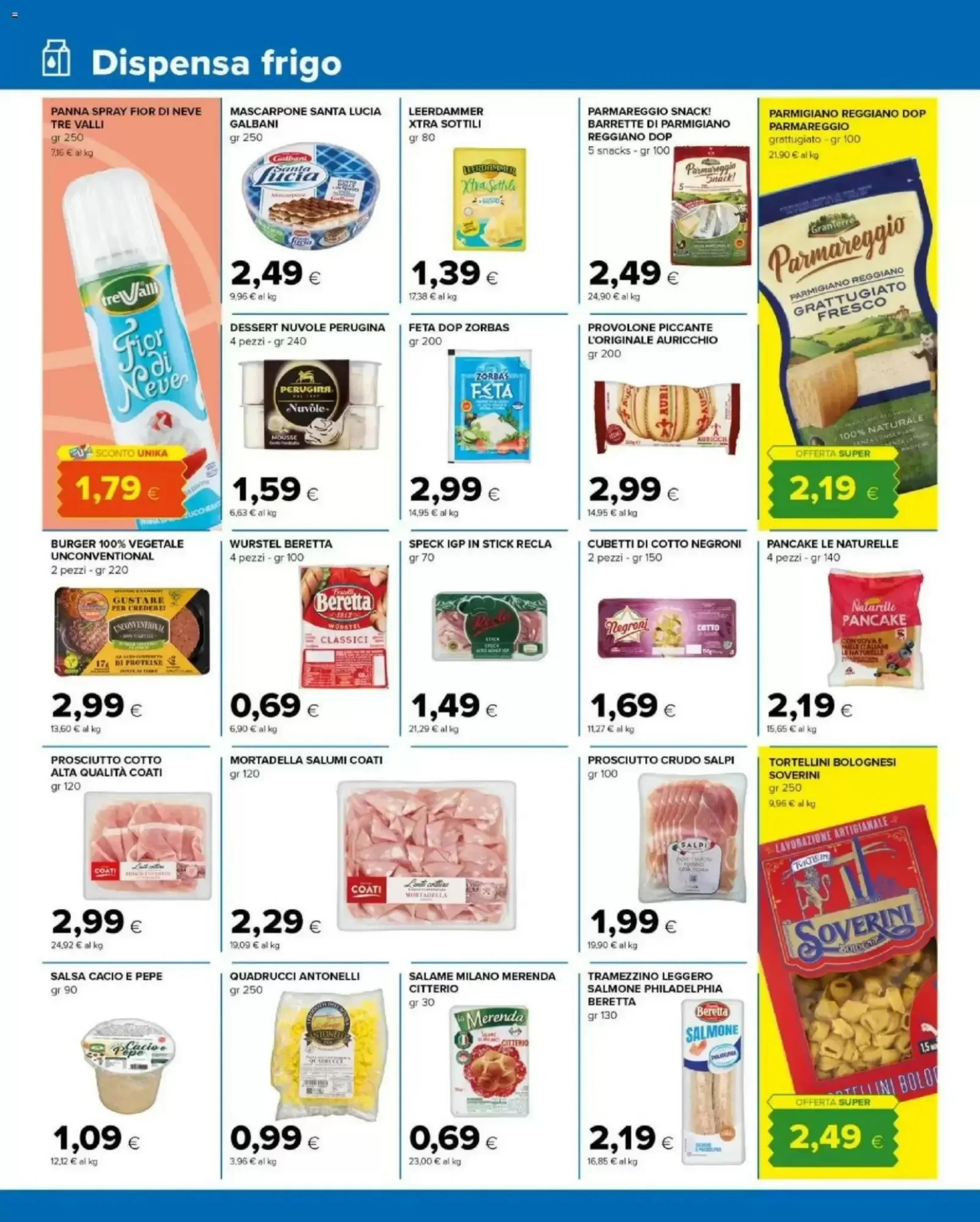 Nel reparto carne e salumi, le offerte partono da 0,69€ per i wurstel Beretta da 100 g, una scelta veloce per snack o per arricchire panini. La mortadella "La Centenaria" è in promozione a 0,99€ l'etto, perfetta per antipasti. Il prosciutto cotto è disponibile a 1,29€, così come la mortadella Pallina Fiorucci a 1,80€. Per chi ama i sapori più intensi, le sottilette burger con cheddar costano 1,89€ e il prosciutto crudo Salpi è in offerta a 1,99€.